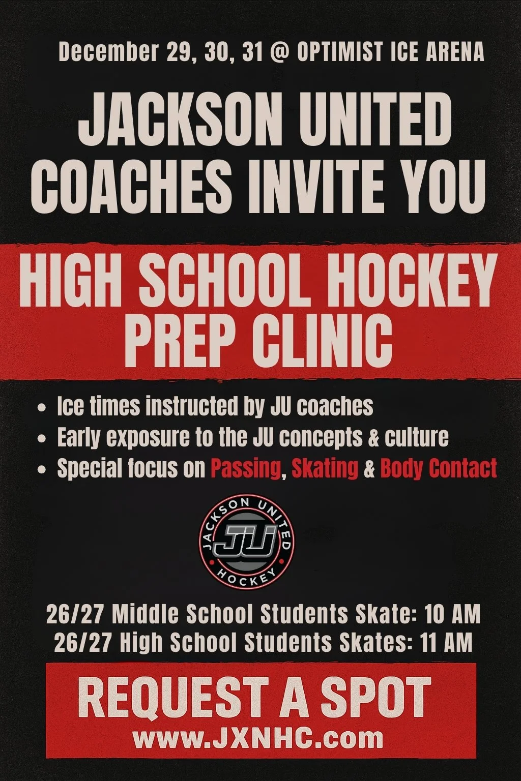 Monday 12/29: 10:00 a.m. Check-In · 10:40 a.m. Pre-Skate · 11:00 a.m. On Ice